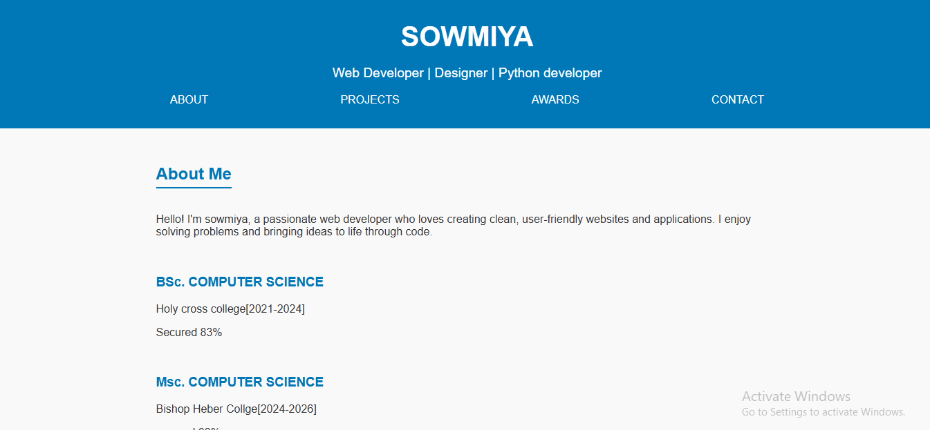 Hello! I'm sowmiya, a passionate web developer who loves creating clean, user-friendly websites and applications. I enjoy solving problems and bringing ideas to life through code.